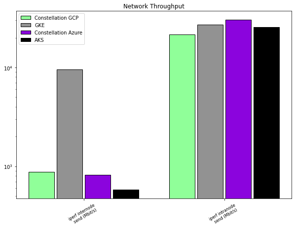 Constellation's bandwidth for both sending and receiving is at 31 Gbps on Azure and 22 Gbps on GCP. AKS achieves 26 Gbps and GKE achieves about 27 Gbps in the tests.